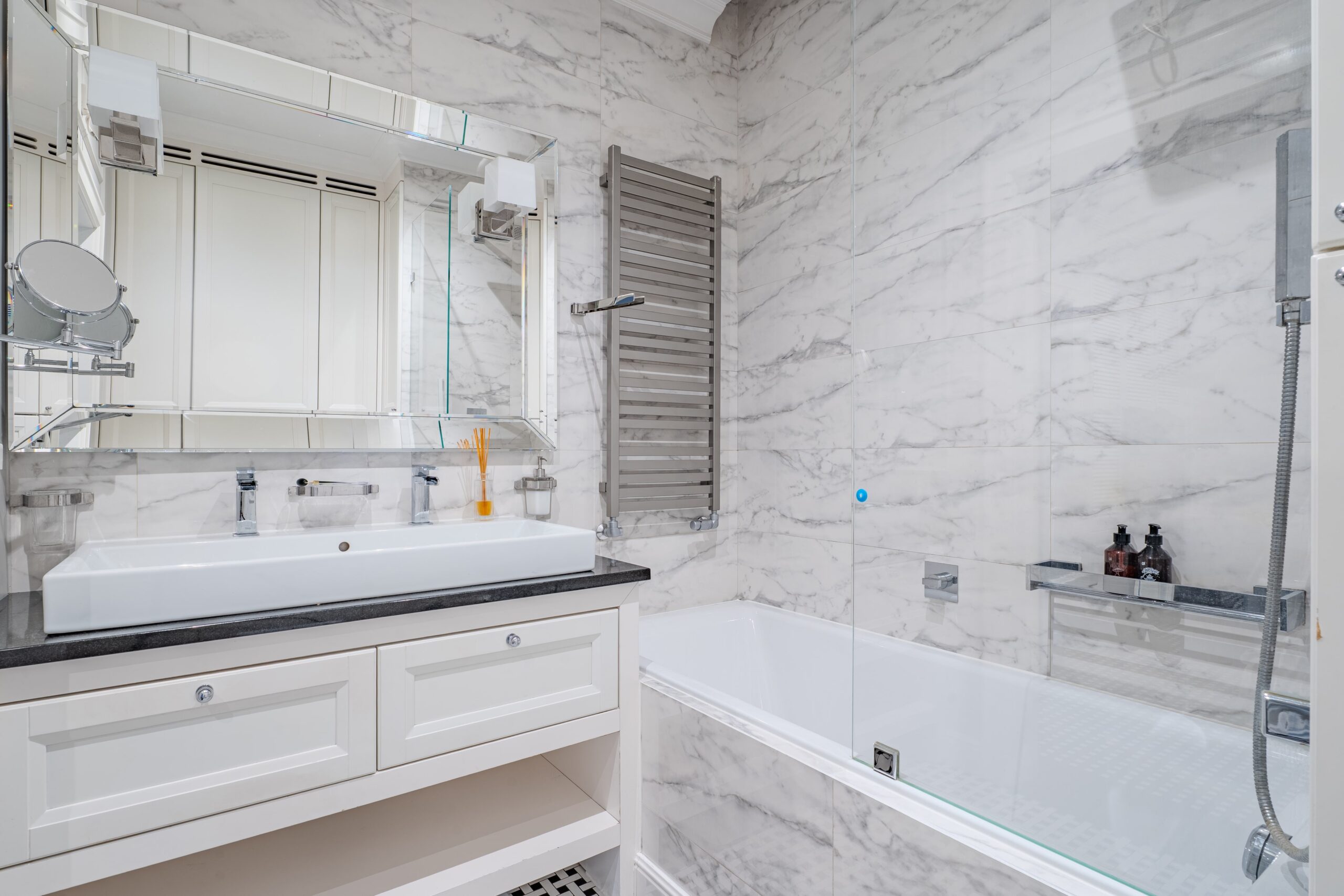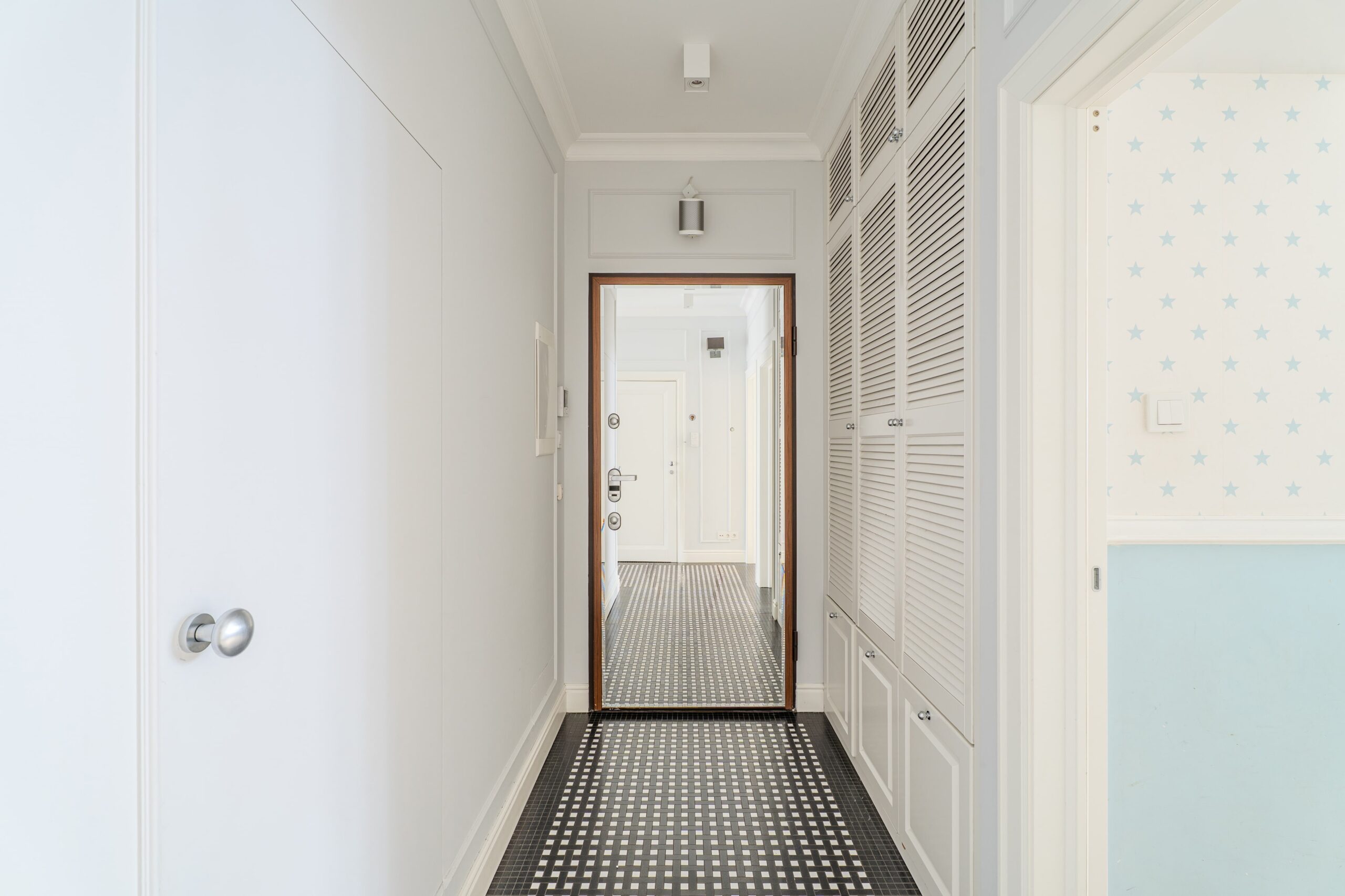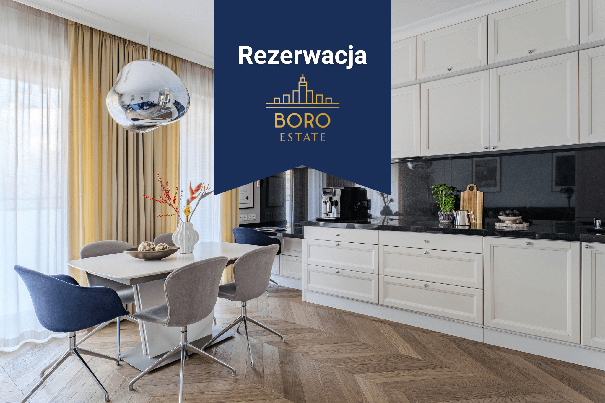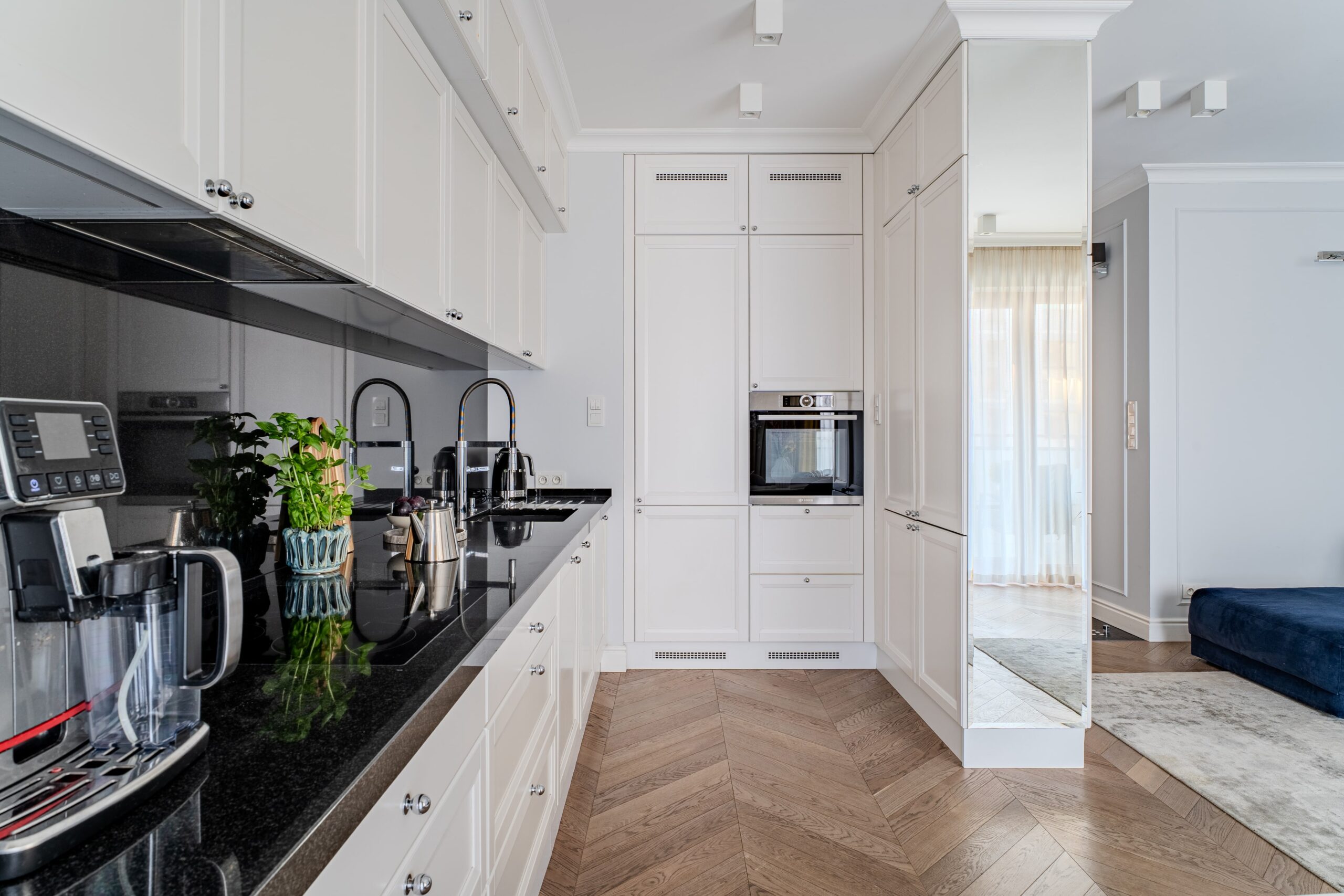 Nieruchomość została wykończona w eleganckim, klasycznym stylu z dbałością o detale. Blaty w kuchni i łazience wykonano z granitu. W salonie i mniejszej sypialni znajduje się dębowy parkiet ułożony w jodełkę, w łazience i przedpokoju — ceramiczna mozaika, a w sypialni głównej — wysokiej jakości wykładzina.