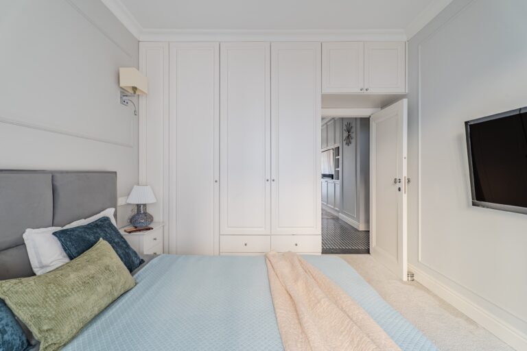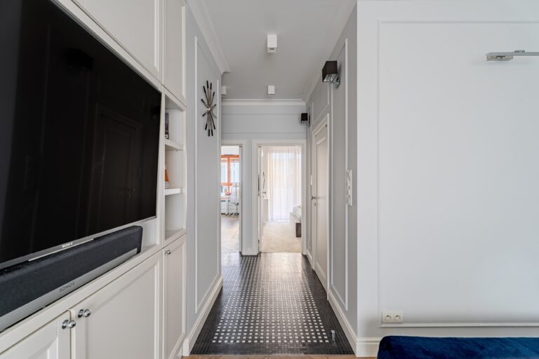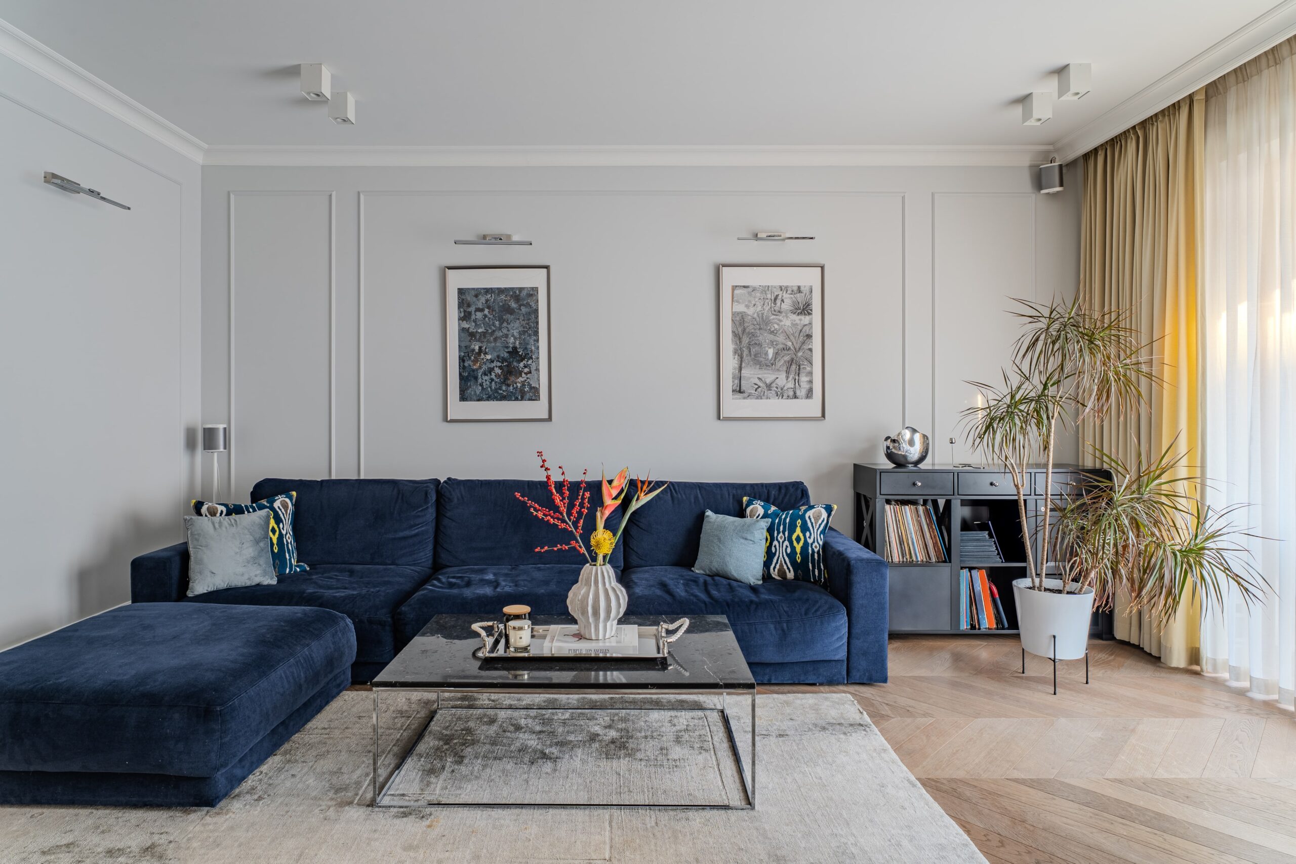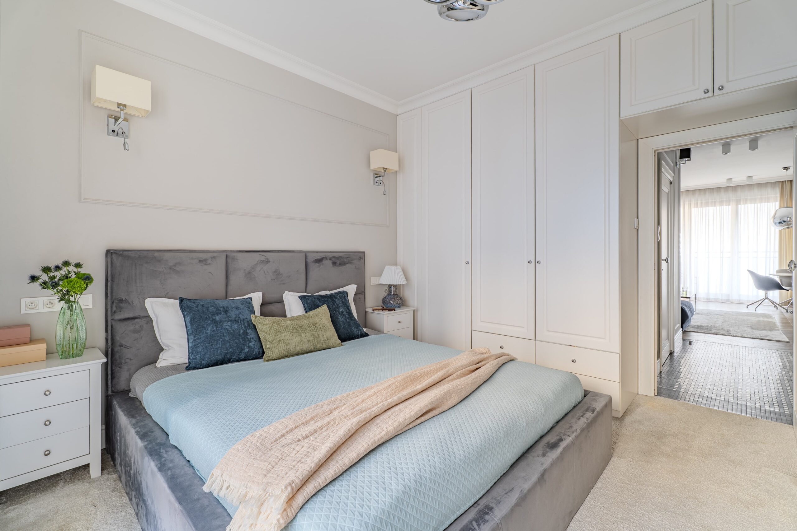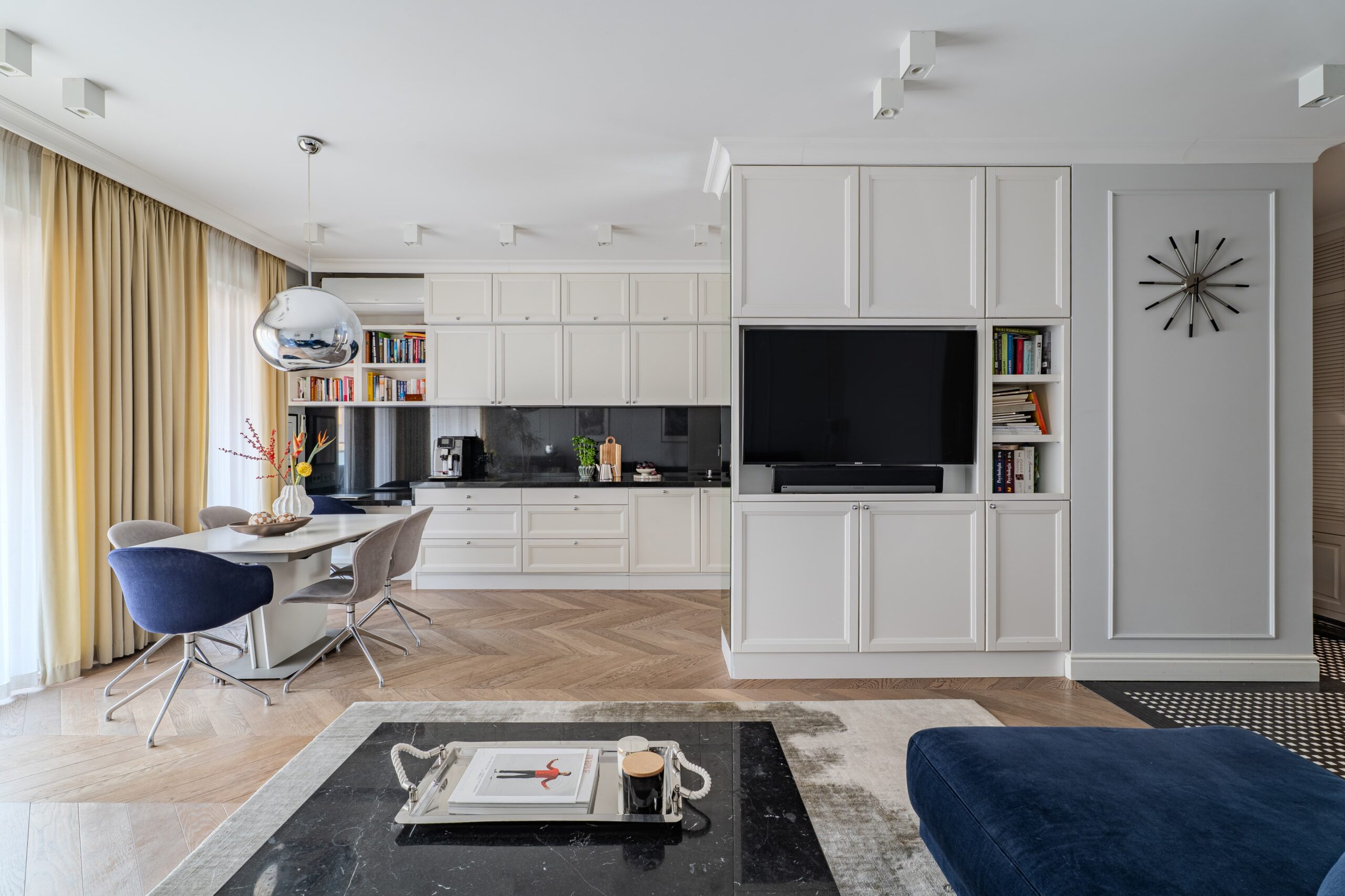 Większość mebli wykonano na wymiar, co zapewnia elegancki wygląd oraz dużą ilość miejsca do przechowywania. W mieszkaniu rozmieszczono liczne punkty oświetleniowe, które tworzą przytulny klimat.
