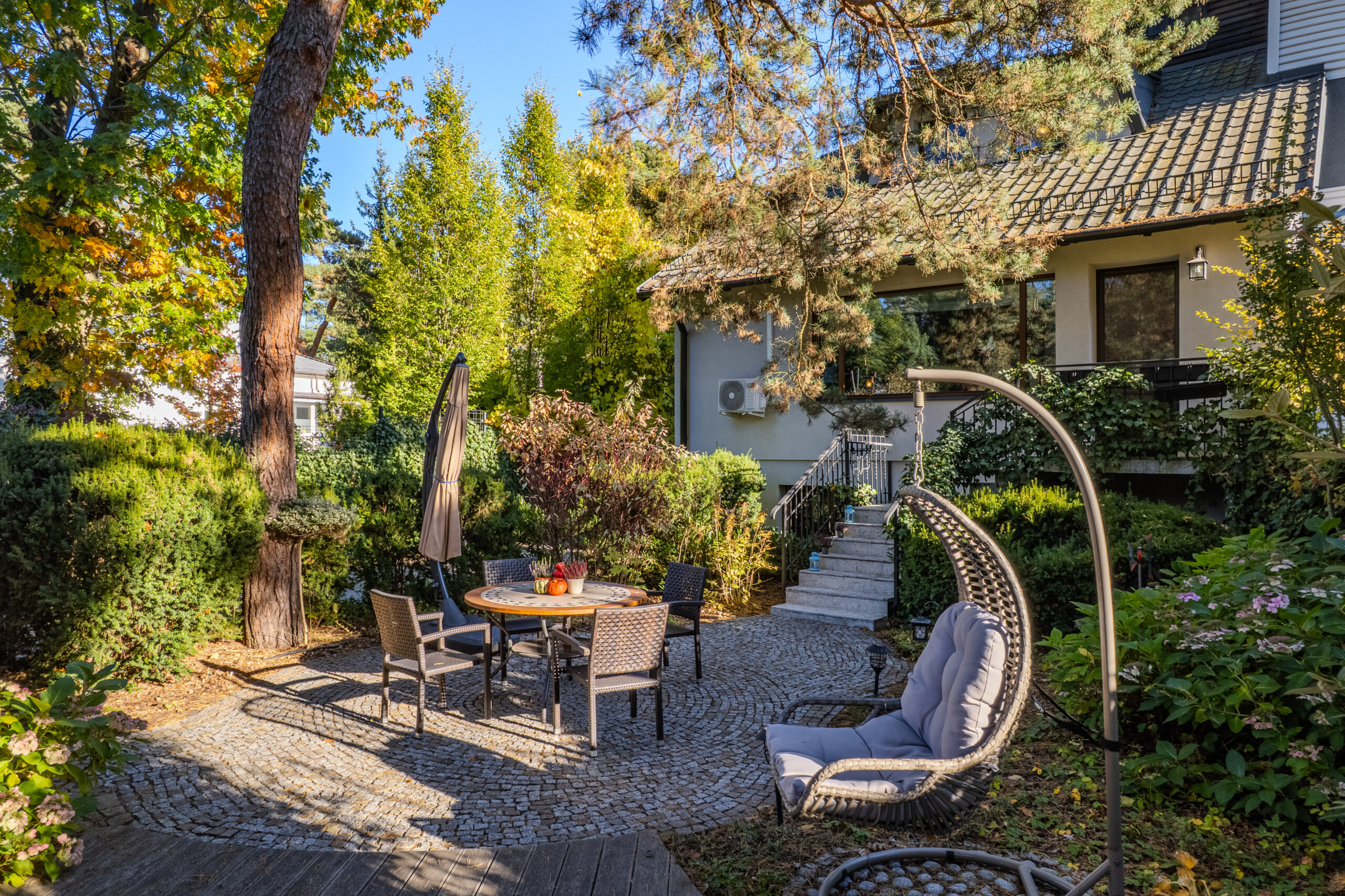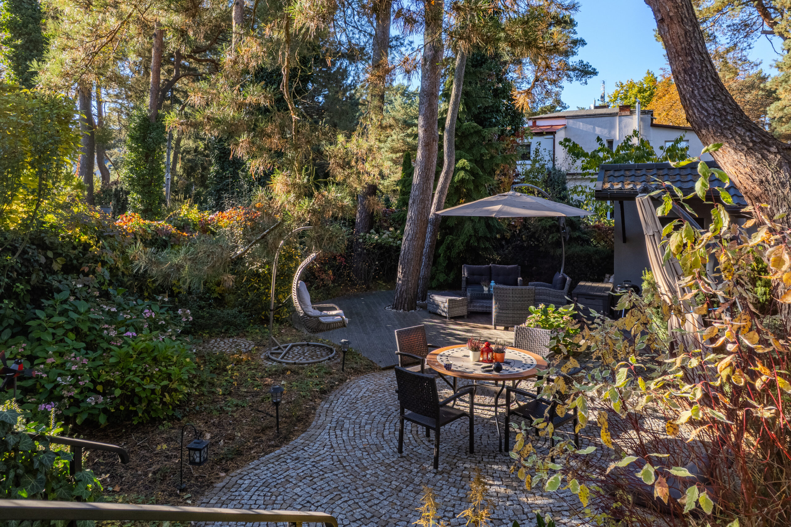 Działka o pow. 443 m2 została starannie zaprojektowana przez architekta krajobrazu. Znajduje się na niej wiata, garaż z pomieszczeniem gospodarczym (31 m2), drewniany taras z modrzewia syberyjskiego oraz alejki z kostki granitowej. W ogrodzie liczne nasadzenia – cisy, hortensje, róże, magnolia, kalina, sosny – oraz automatyczny system nawadniania.