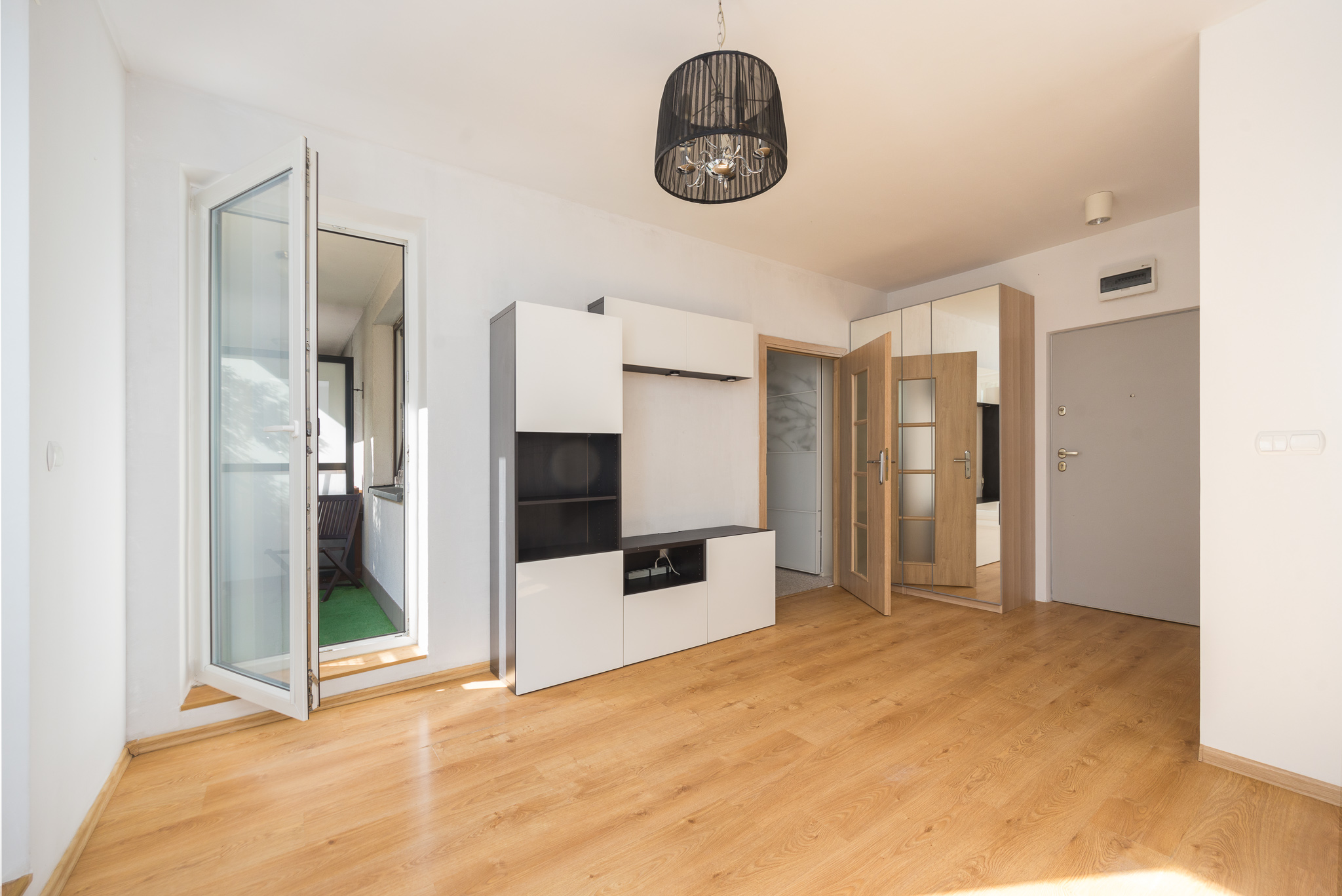 Funkcjonalny układ pomieszczeń pozwolił wygospodarować salon z aneksem oraz oddzielną sypialnię na niespełna 38 m².