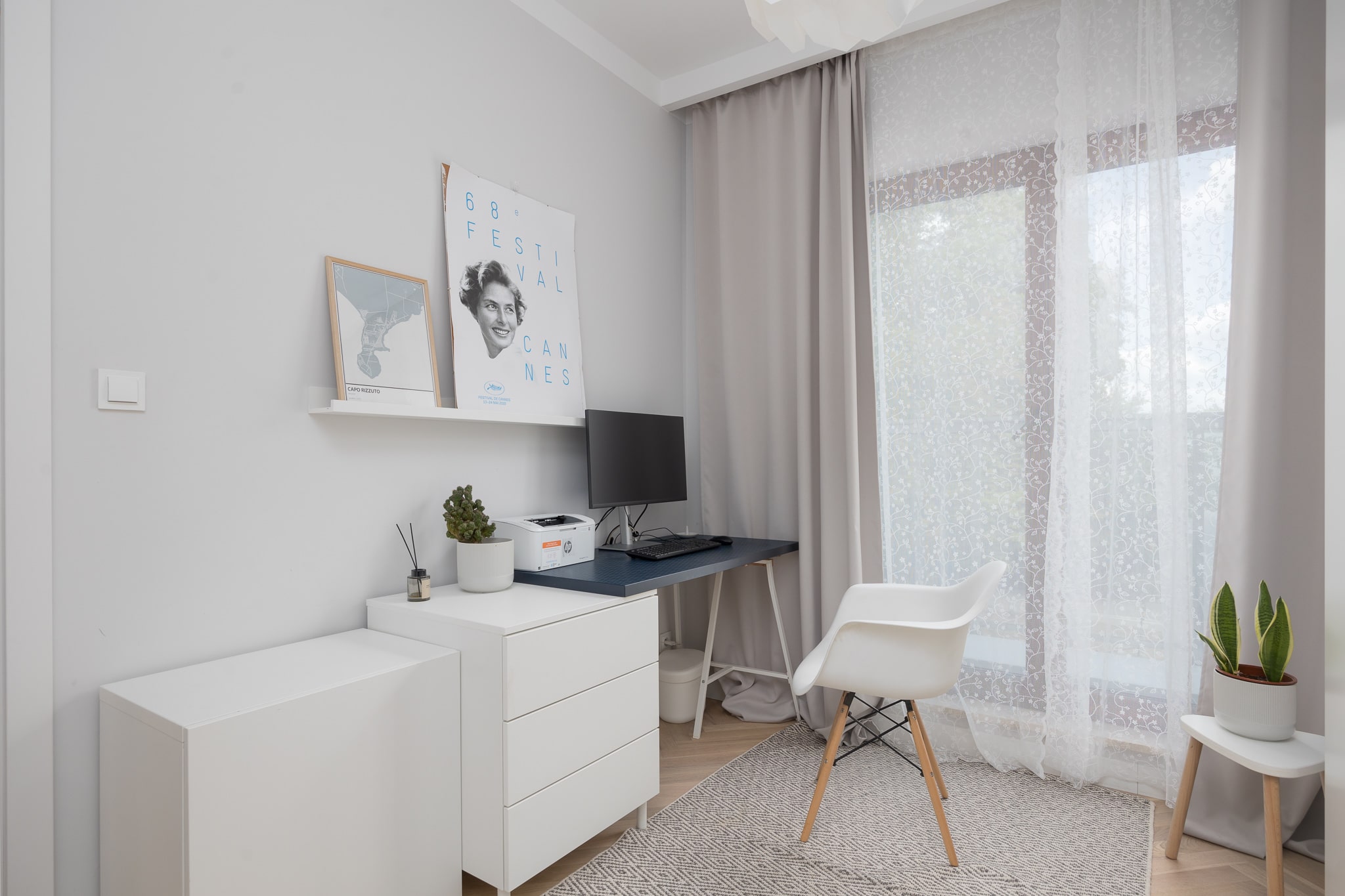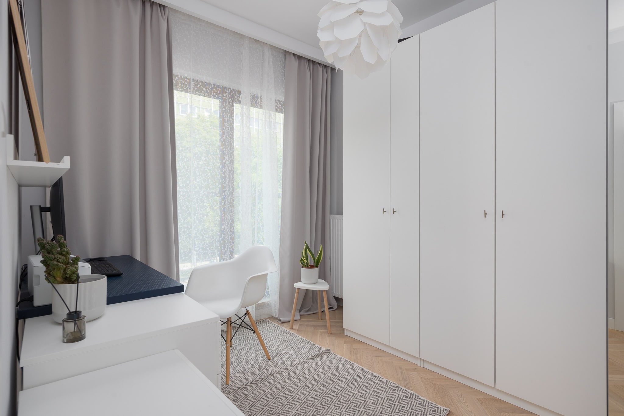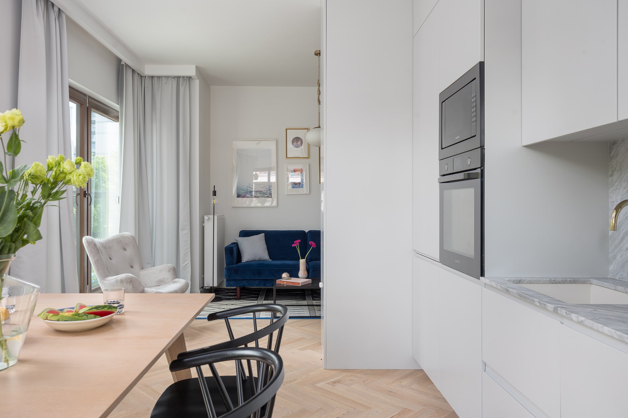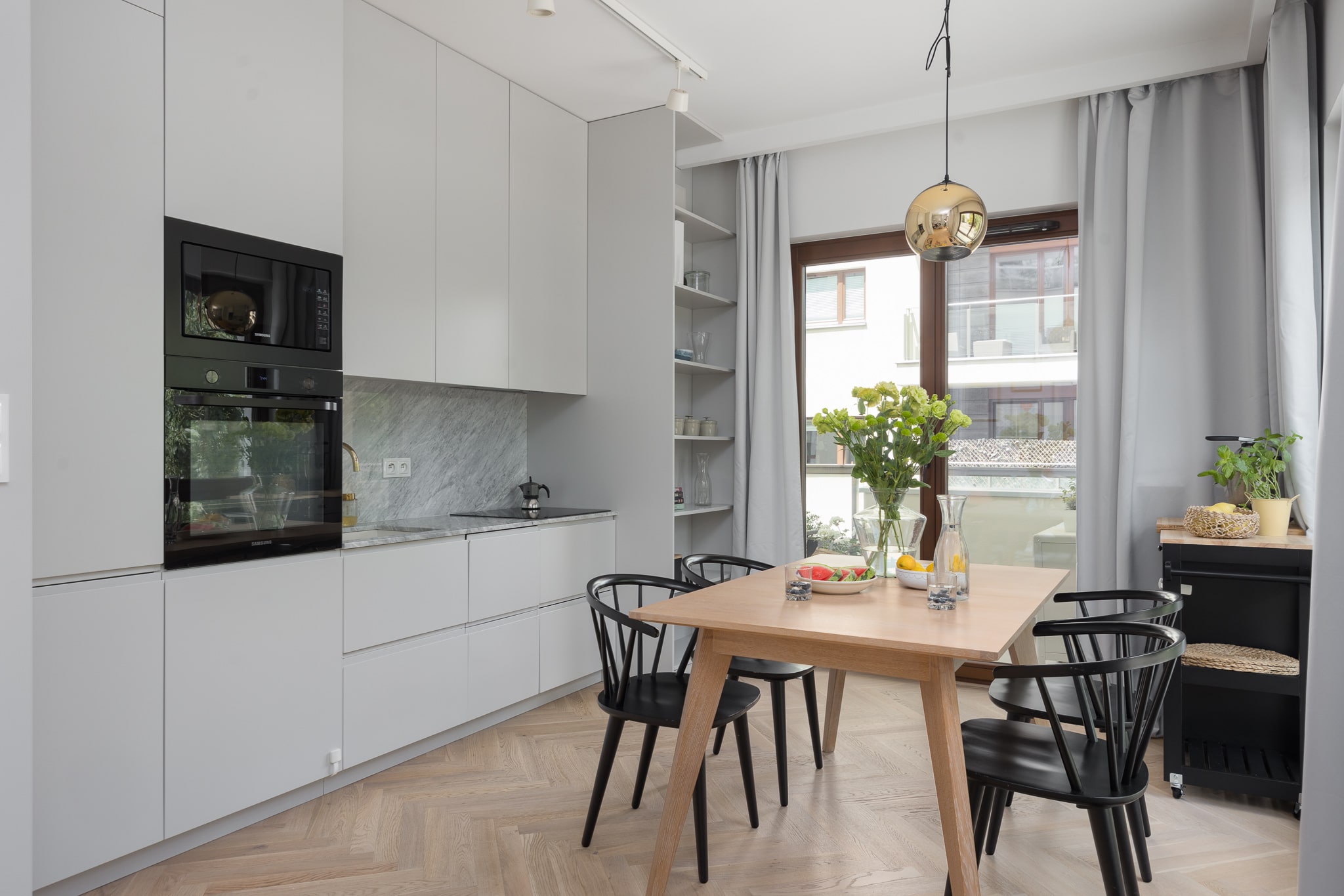 Nieruchomość jest urządzona w stylu skandynawskim z dużą dbałością o detale, a użyte do jego wykończenia materiały są najwyższej jakości. Blaty w kuchni i łazience wykonane zostały z marmuru calacatta, na podłodze w łazience zastosowano elegancki gres, a w pozostałej części mieszkania naturalny dębowy parkiet ułożony w modną jodełkę.