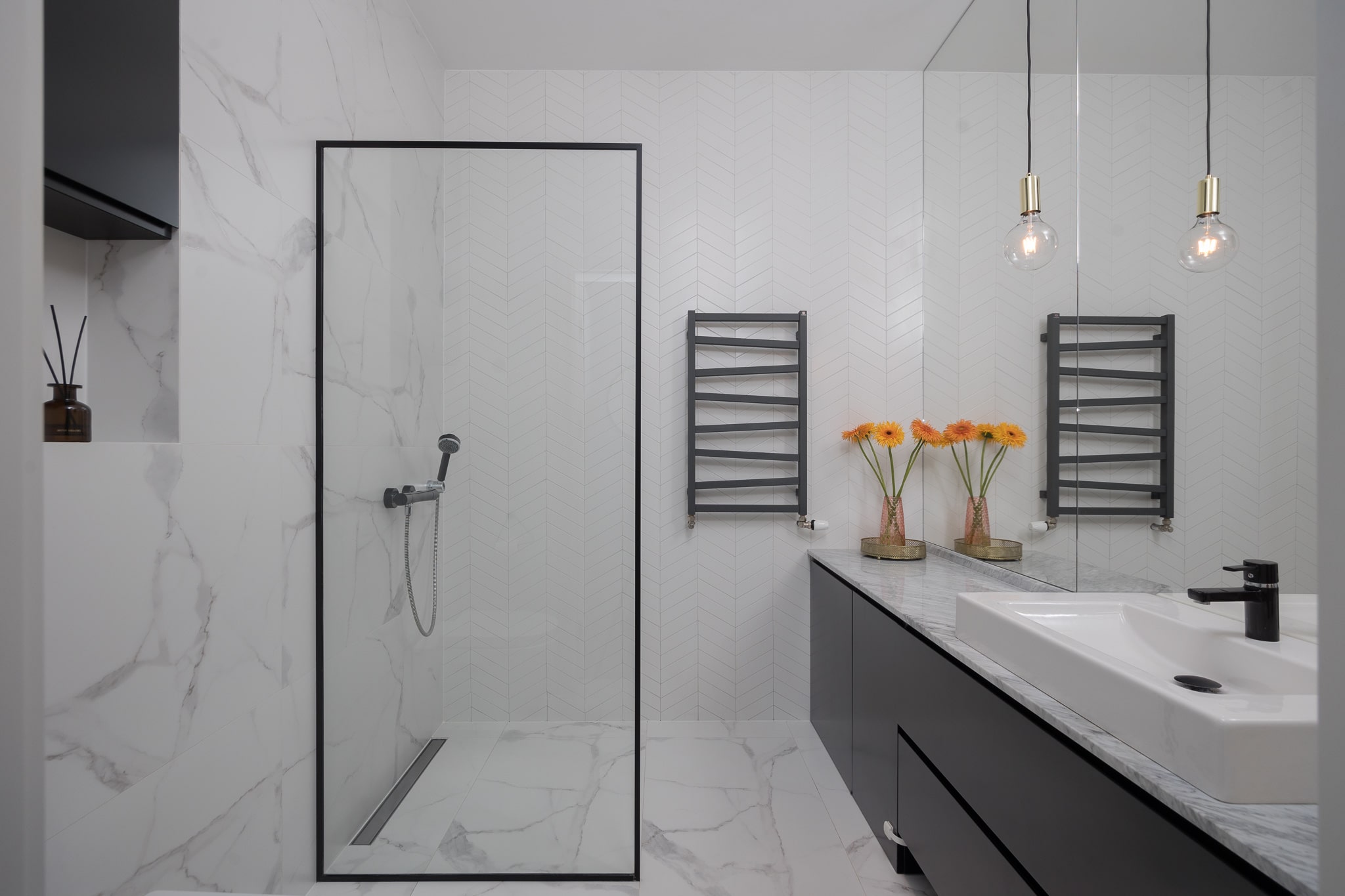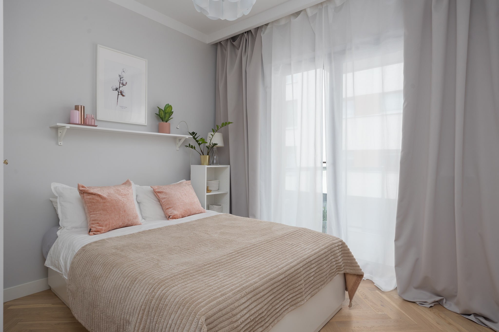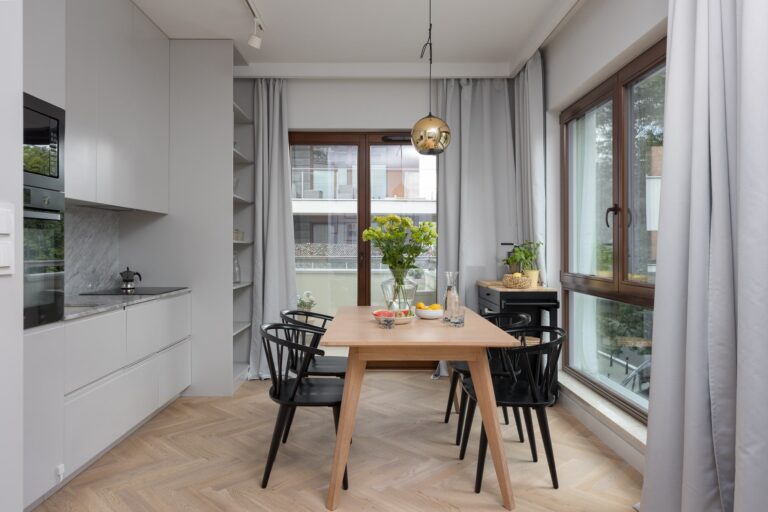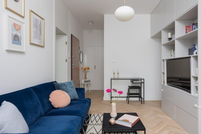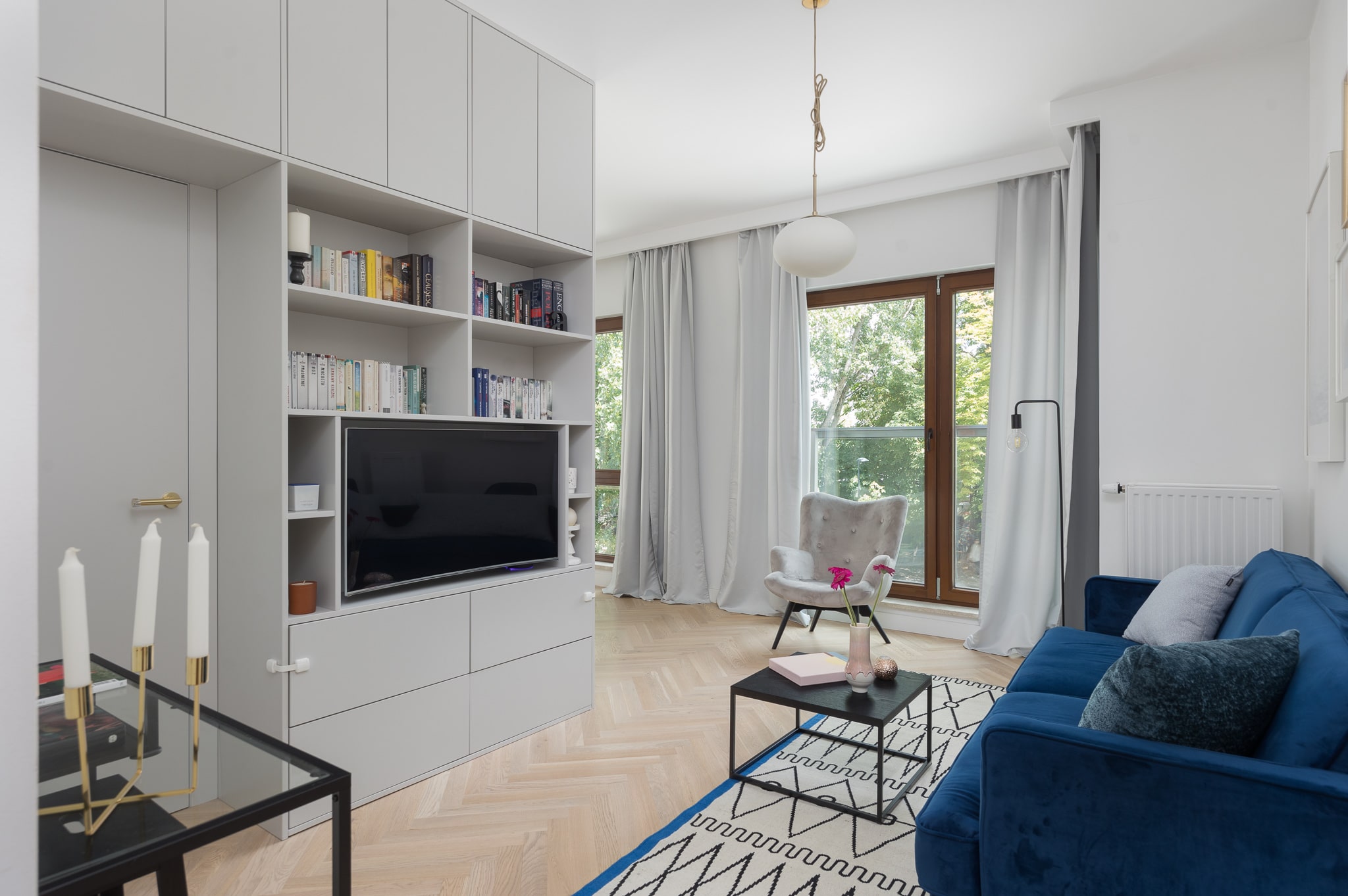 Nieruchomość jest urządzona w stylu skandynawskim z dużą dbałością o detale, a użyte do jego wykończenia materiały są najwyższej jakości. Blaty w kuchni i łazience wykonane zostały z marmuru calacatta, na podłodze w łazience zastosowano elegancki gres, a w pozostałej części mieszkania naturalny dębowy parkiet ułożony w modną jodełkę.
